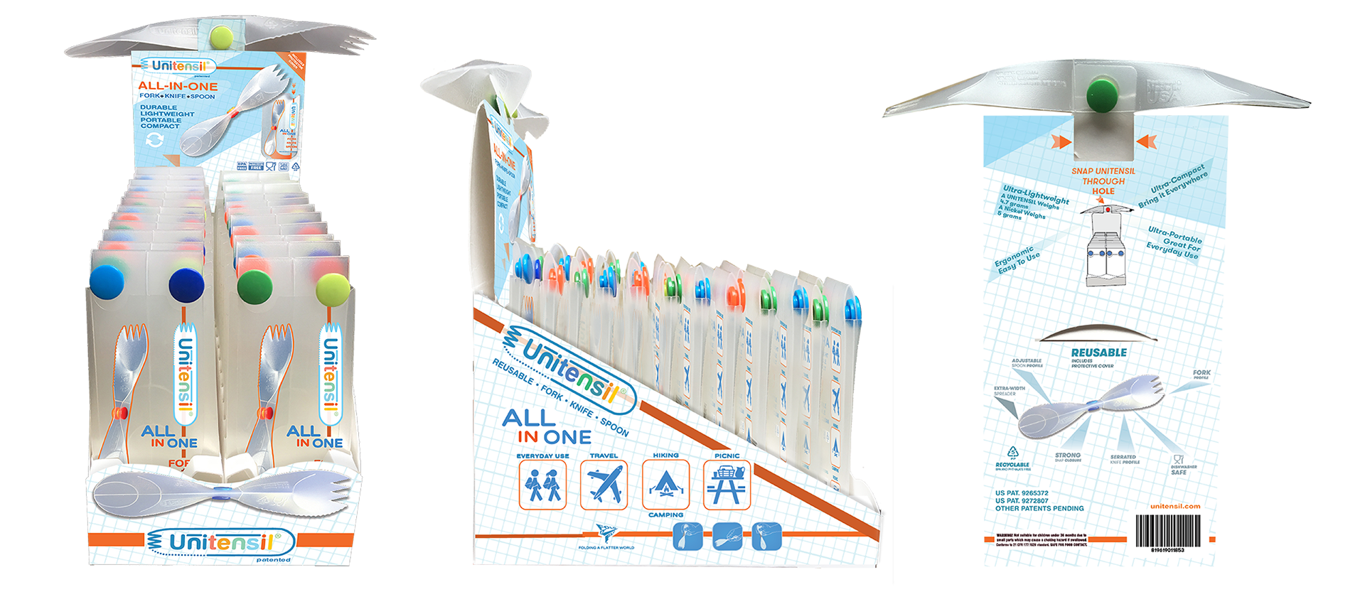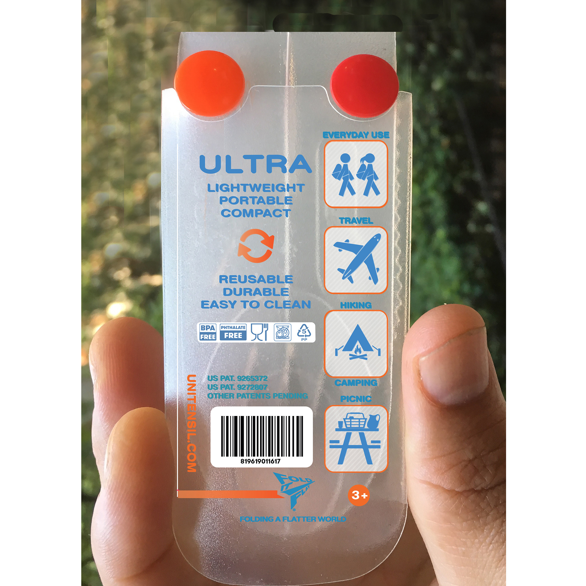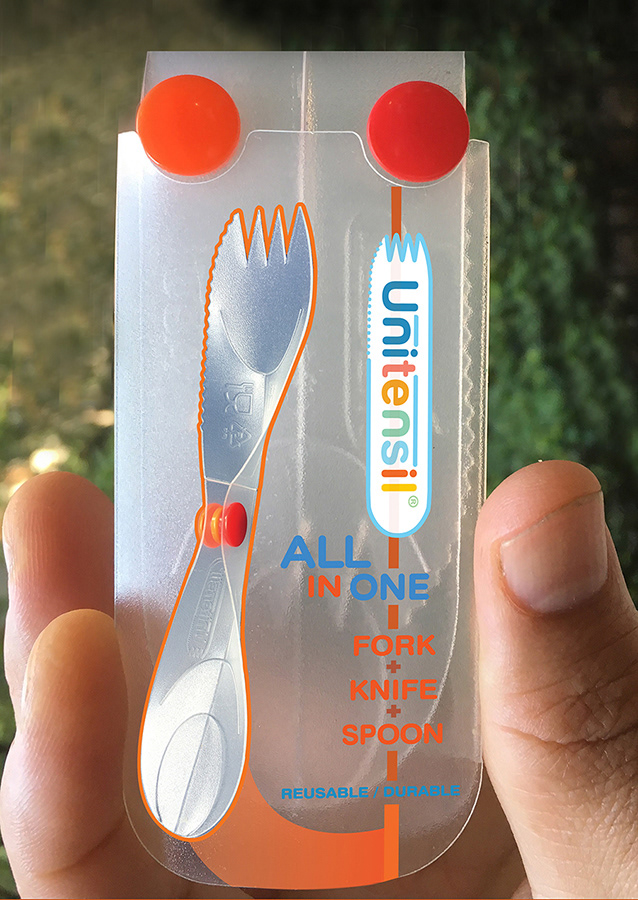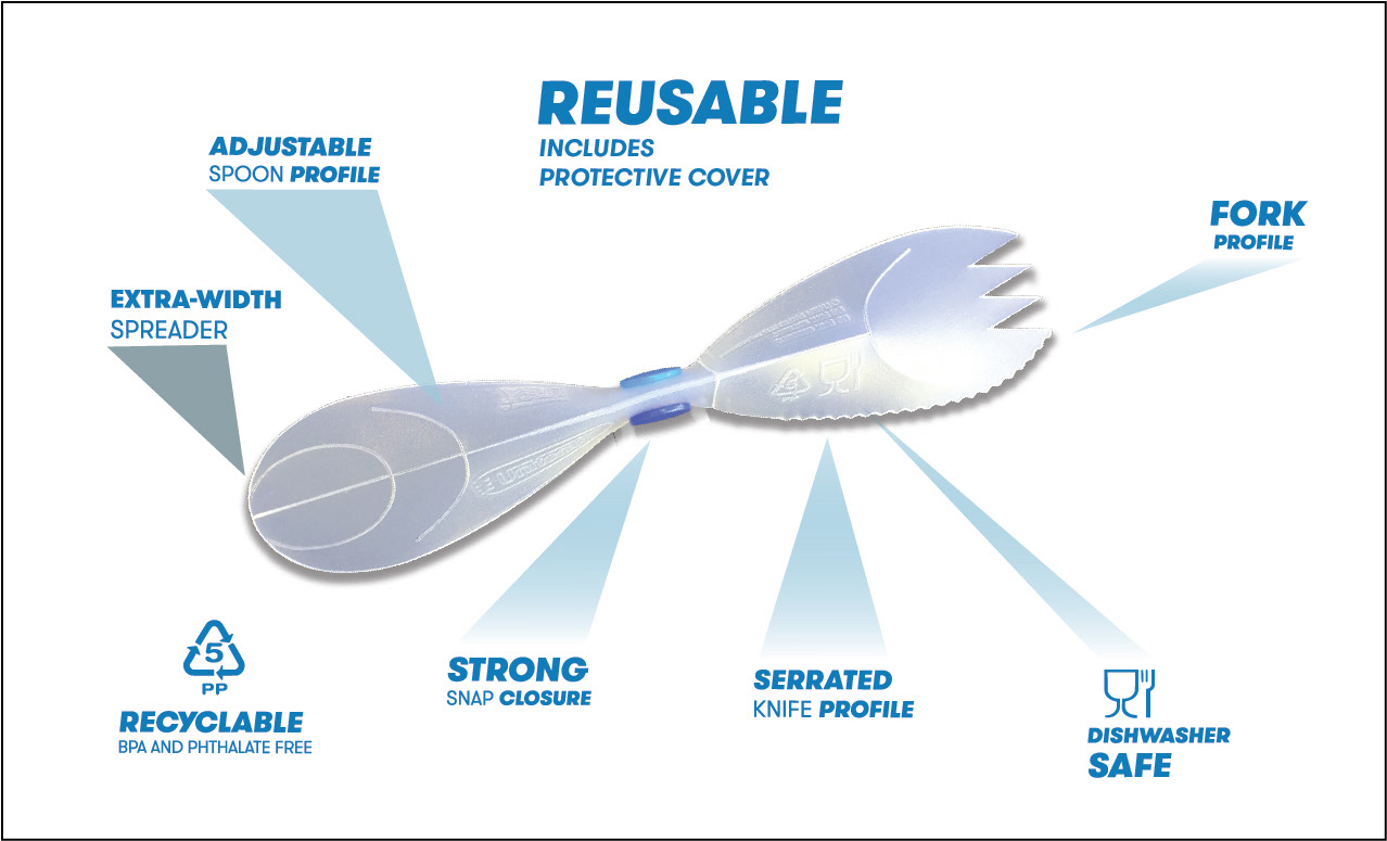 All in One Reusable Utensil Folds very compactly, Invented, patented, branded, marketed, licensed.